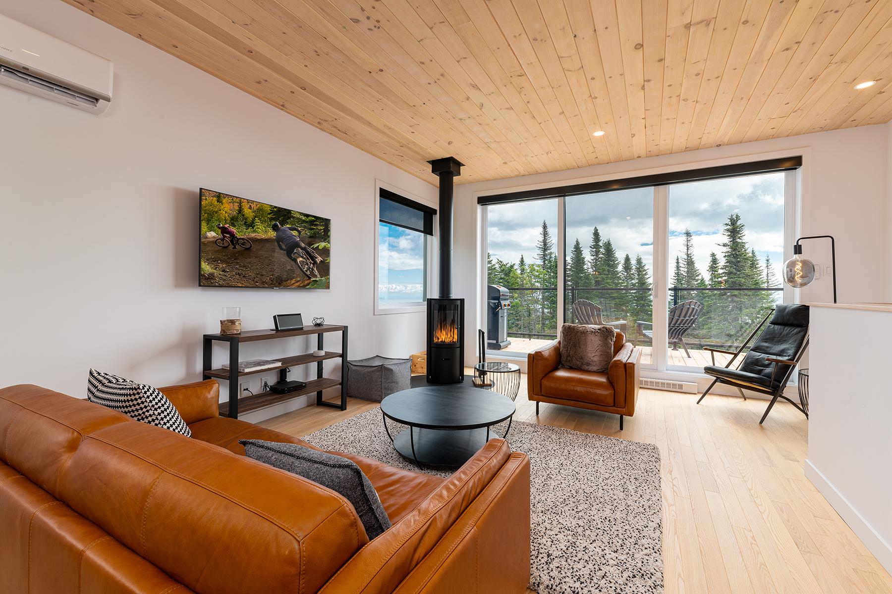 The Chalets-Forêt are perched in a coniferous forest overlooking the St. Lawrence Valley and offer a breathtaking view of the river and the mountain. The chalets spread out on several levels: the living spaces on the top level that offer a panoramic view and the bedrooms on the intermediate level with views on the forest.