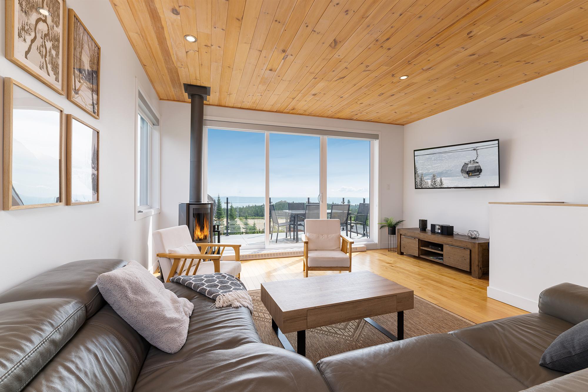 The Chalets-Forêt are perched in a coniferous forest overlooking the St. Lawrence Valley and offer a breathtaking view of the river and the mountain. The chalets spread out on several levels: the living spaces on the top level that offer a panoramic view and the bedrooms on the intermediate level with views on the forest.