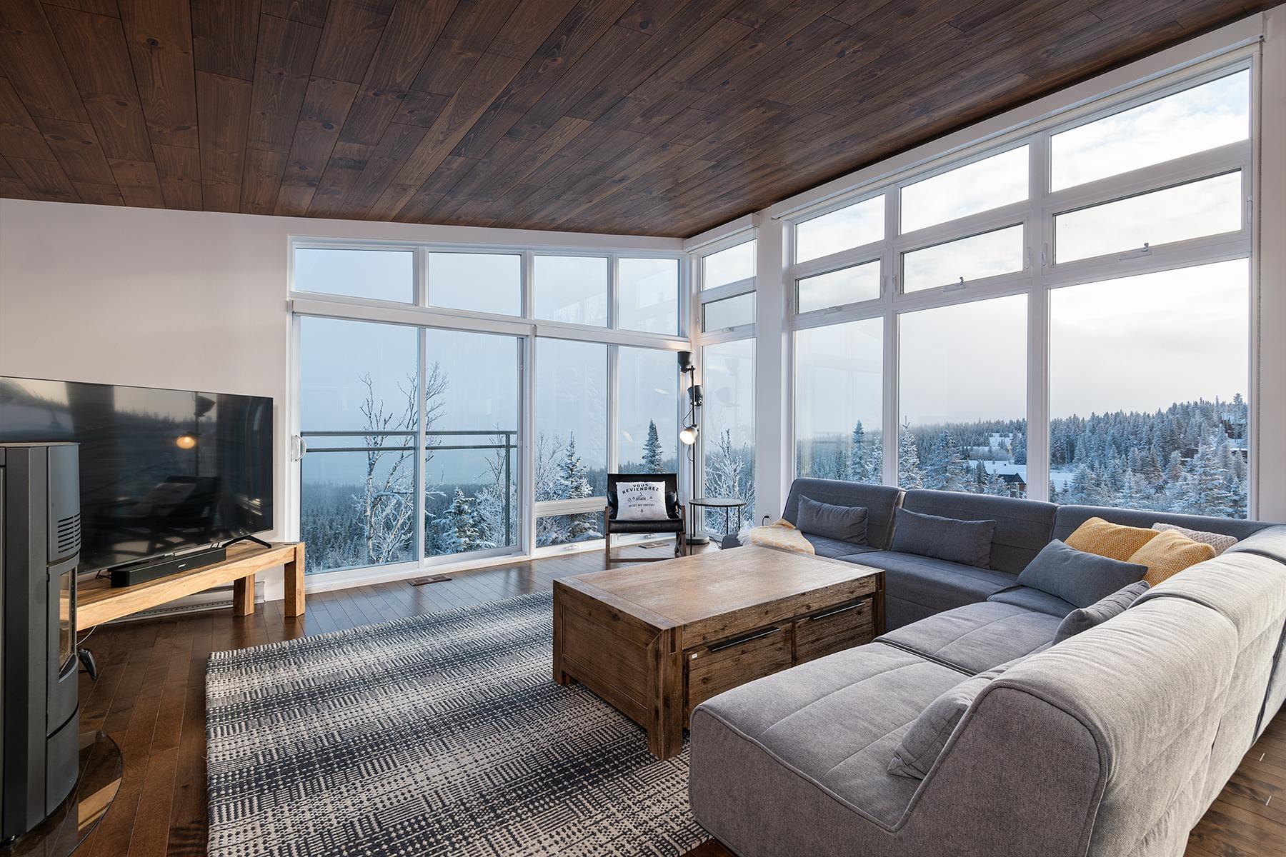 Les Chalets-Forêt sont perchés dans une forêt de conifères surplombant la vallée du Saint-Laurent et offrent une vue imprenable sur le fleuve et sur la montagne. Les chalets se déclinent sur différents niveaux : les pièces de vie au niveau supérieur, ouvrant sur une vue panoramique et les chambres au niveau intermédiaire, offrant des percées visuelles à travers le sous-bois.