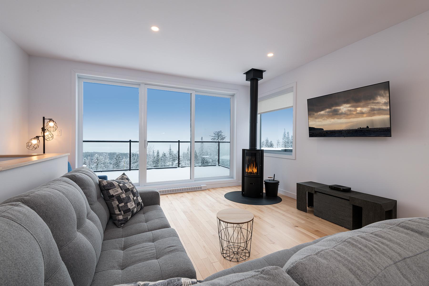 Les Chalets-Forêt sont perchés dans une forêt de conifères surplombant la vallée du Saint-Laurent et offrent une vue imprenable sur le fleuve et sur la montagne. Les chalets se déclinent sur différents niveaux : les pièces de vie au niveau supérieur, ouvrant sur une vue panoramique et les chambres au niveau intermédiaire, offrant des percées visuelles à travers le sous-bois.