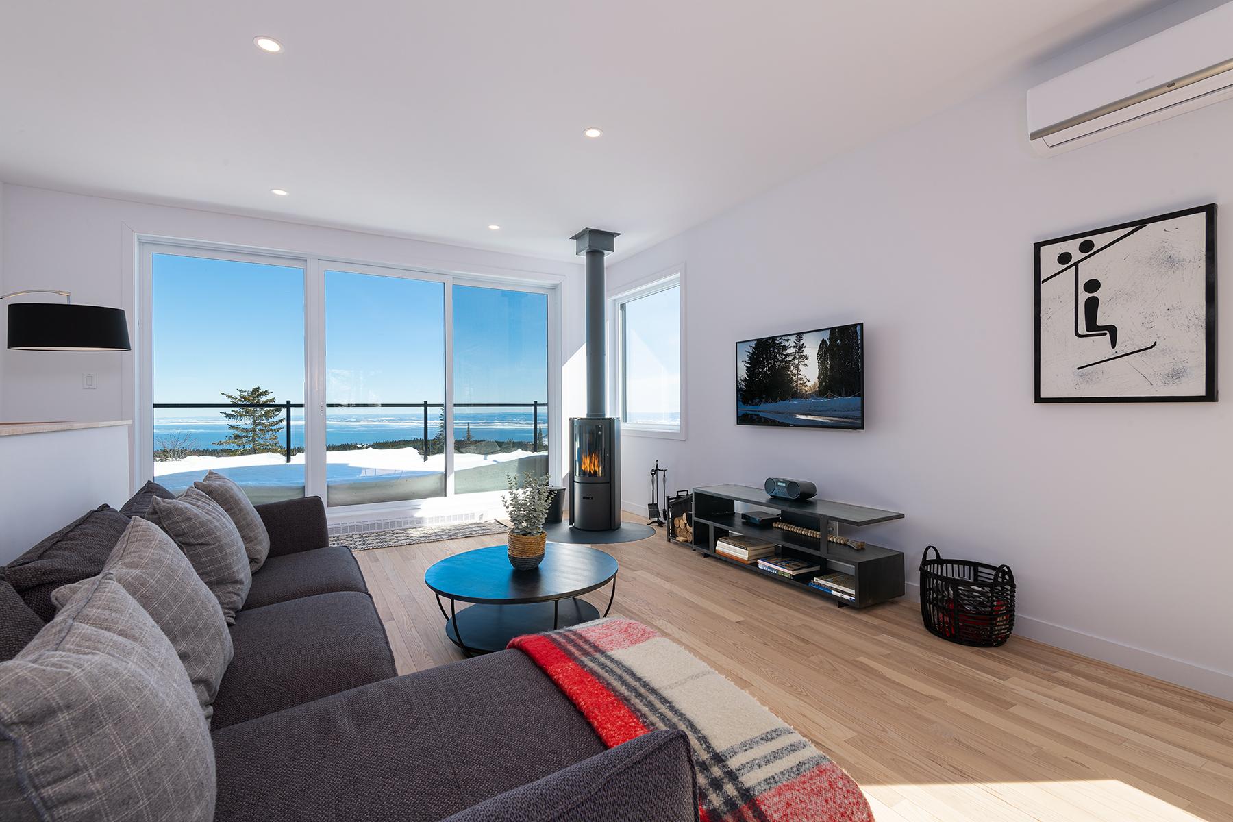 Les Chalets-Forêt sont perchés dans une forêt de conifères surplombant la vallée du Saint-Laurent et offrent une vue imprenable sur le fleuve et sur la montagne. Les chalets se déclinent sur différents niveaux : les pièces de vie au niveau supérieur, ouvrant sur une vue panoramique et les chambres au niveau intermédiaire, offrant des percées visuelles à travers le sous-bois.