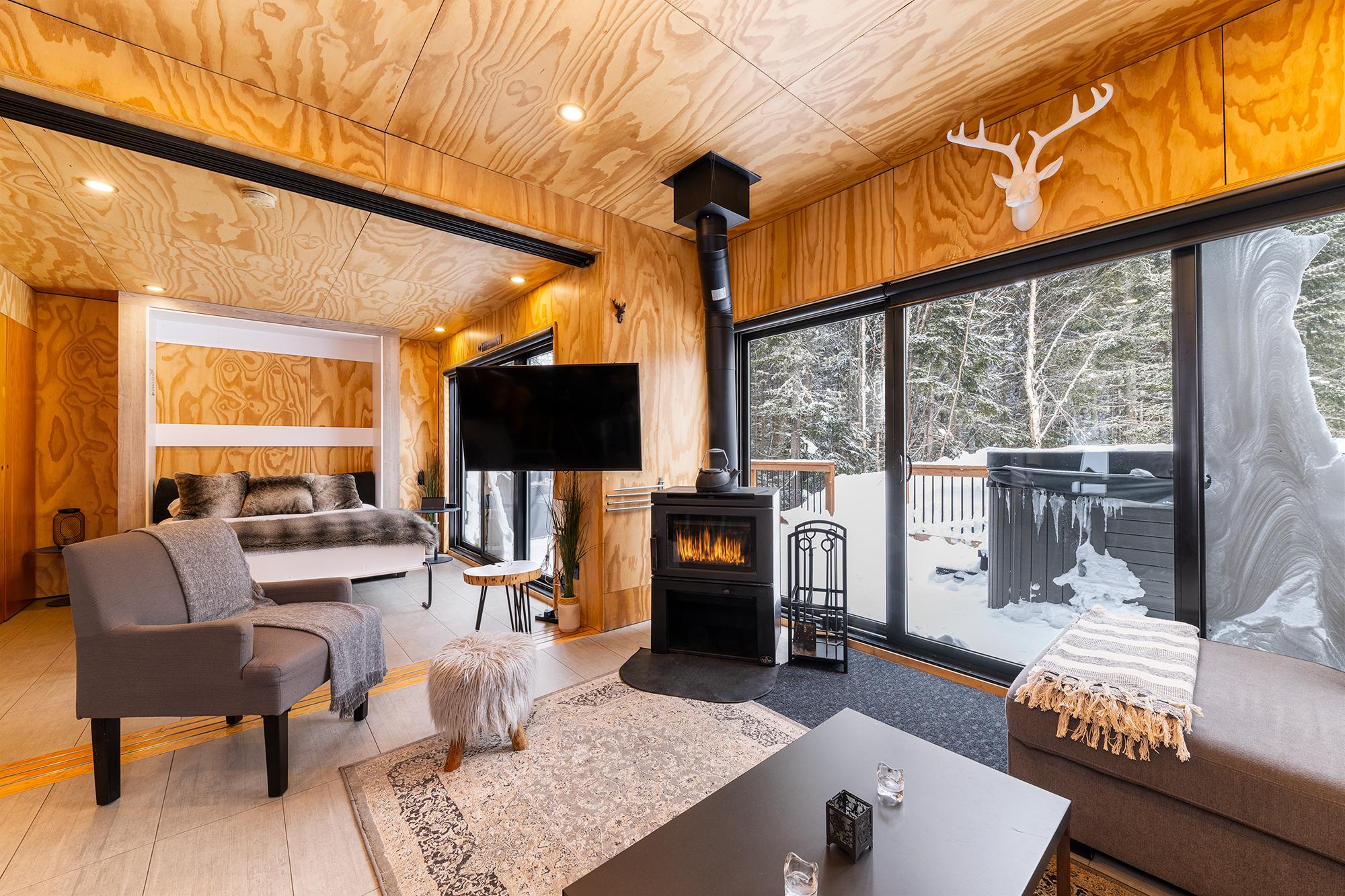 Cette unité vient équipée d’un système de chauffage radiant dans toutes les pièces, d’un foyer au bois, d’une fenestration généreuse, d’une finition intérieure unique en bois, d’une pièce de type « mud-room » pour ranger les équipements de plein-air, de plomberie de qualité et d’un îlot central multi-usage surdimensionné. Le type de construction modulaire permet un niveau de finition supérieur et un confort inégalé.