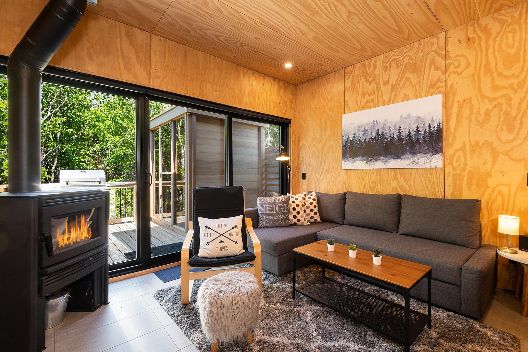 Cette unité vient équipée d’un système de chauffage radiant dans toutes les pièces, d’un foyer au bois, d’une fenestration généreuse, d’une finition intérieure unique en bois, d’une pièce de type « mud-room » pour ranger les équipements de plein-air, de plomberie de qualité et d’un îlot central multi-usage surdimensionné. Le type de construction modulaire permet un niveau de finition supérieur et un confort inégalé.